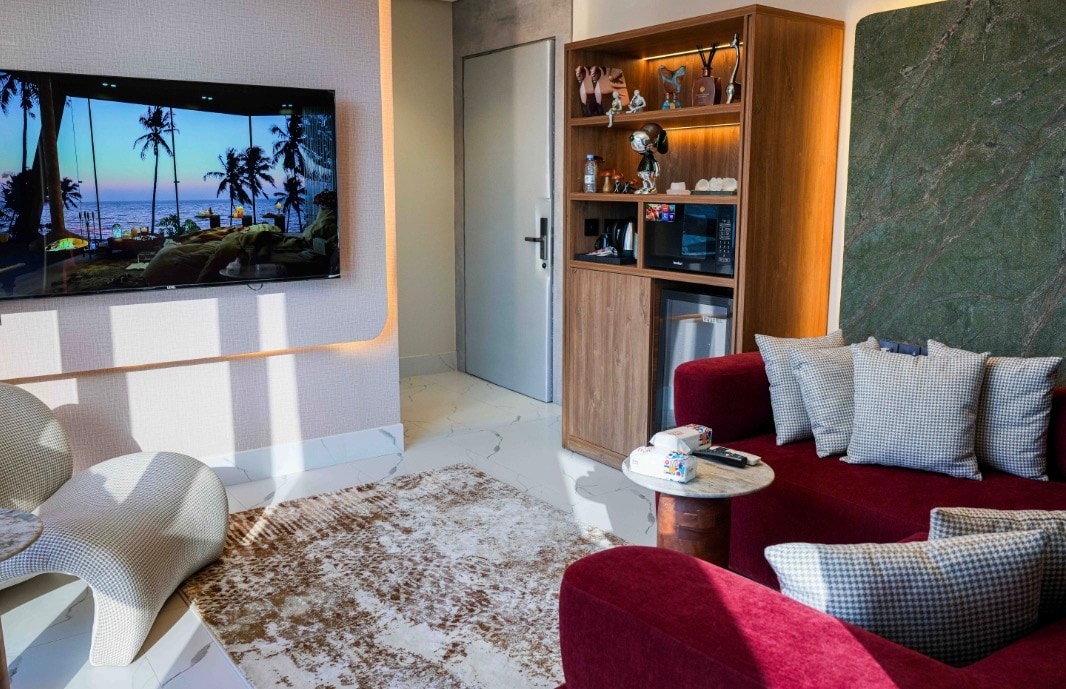 Enjoy a spacious and elegant 2-bedroom apartment with a private balcony offering stunning sea views. Features include a modern kitchen, a large living room, a laundry room with washer and dryer, high-speed Wi-Fi, smart TV, air purifier, and daily housekeeping service. Perfect for families and professionals seeking comfort, space, and a peaceful coastal atmosphere.