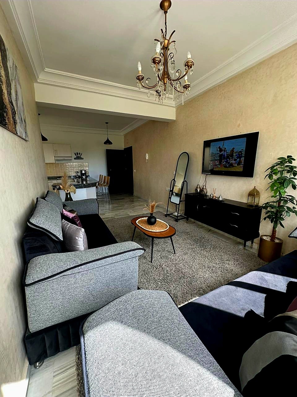 Bienvenue dans ce charment appartement situé au Rdc à Tanger, idéalement placé à proximité de la plage, de la foret et de l'aéroport. Parfait pour les séjours en famille, ce logement spacieux peut accueillir jusqu'à 6 personnes. La cuisine est équipé pour préparer vos repas comme à la maison. Profitez du WI-Fi gratuit, d'une TV, d'une machine à laver, et d'un parking sécurisé au sein de la résidence Salle de bain fonctionnelle, linge de maison fourni. Couples musulmans non mariés non admis