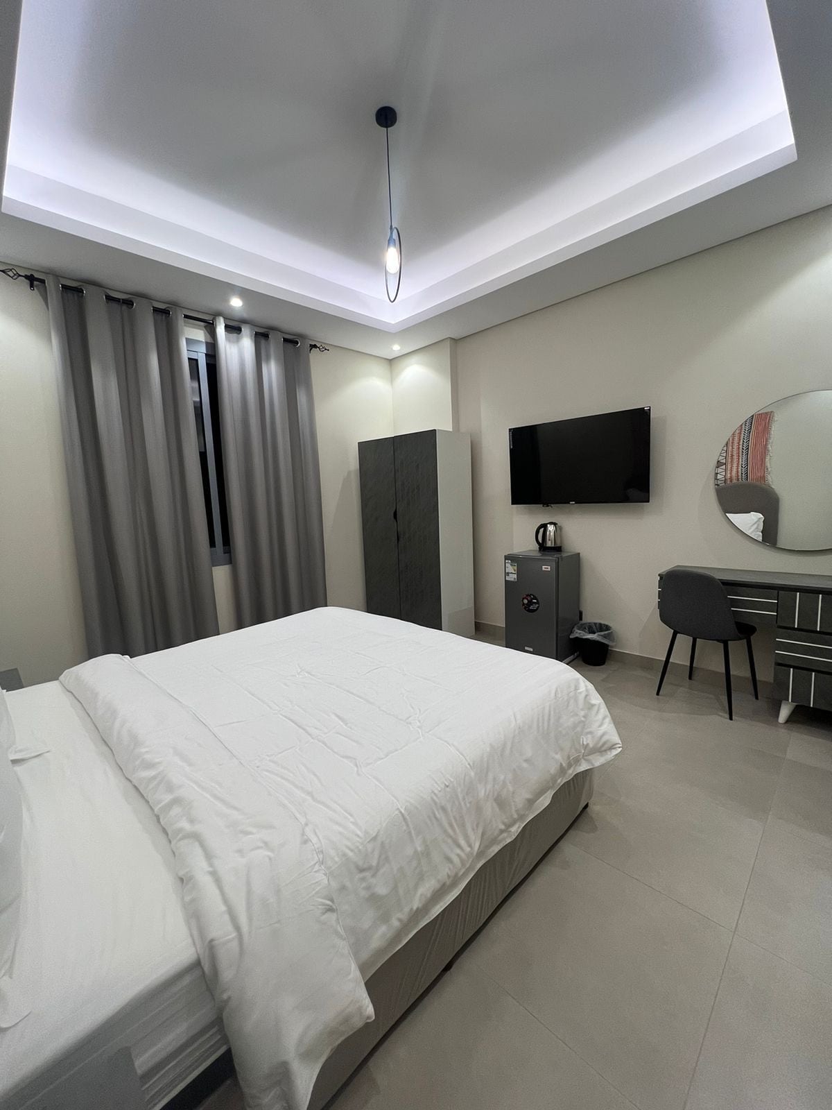 Modern designed penthouse apartment, located in the heart of Jeddah. - The penthouse apartment is located 2 minutes away from Palestine Street, 4 minutes away from Al Haifaa Mall, and 4 minutes away from Jeddah Fountain. - This modern designed penthouse apartment will meet all your vacation needs. - The apartment offers a fully furnished room, living room area, kitchenette, and bathroom. - The apartment has the essentials of a vacation such as a 65-inch TV,5G Wi-Fi , refrigerator, and more.
