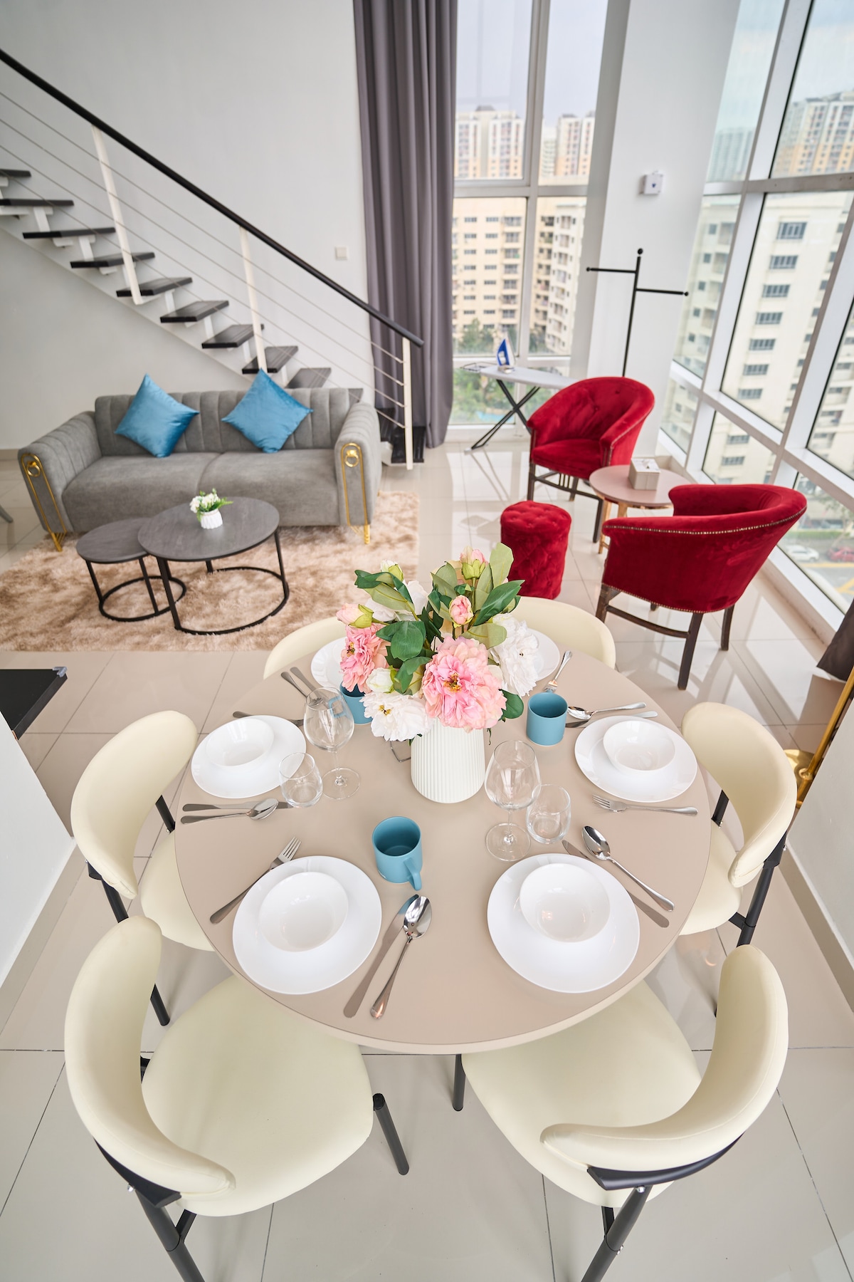 Maritime Suite is located along Karpal Singh Drive, the heart of Georgetown, Penang. It is a duplex apartment which comes with high ceiling and tall windows that offer a breathtaking panoramic sea view in the daytime and stunning city view at night. Our duplex suite is located at the highest floor of Maritime Suite, it comes with: 2 bedrooms 1 living room 2 bathrooms Opened kitchen with dining area.