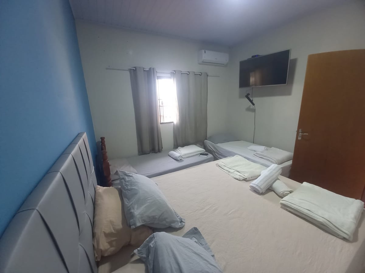 Casa com câmera de segurança externa, espaçosa, recém reformada, ar condicionado nos quartos, banheiro com chuveiro elétrico, tem também ducha externa. Não divide a casa com o anfitrião ou com outros hóspedes. A localização é boa em rua asfaltada, tem mercadinho na esquina, o melhor açougue da cidade fica a 3 quadras, a Havan fica a 1200 metros. Se for querer 2 quartos para apenas 2 hóspedes tem cobrança extra de R$ 40 por diária.