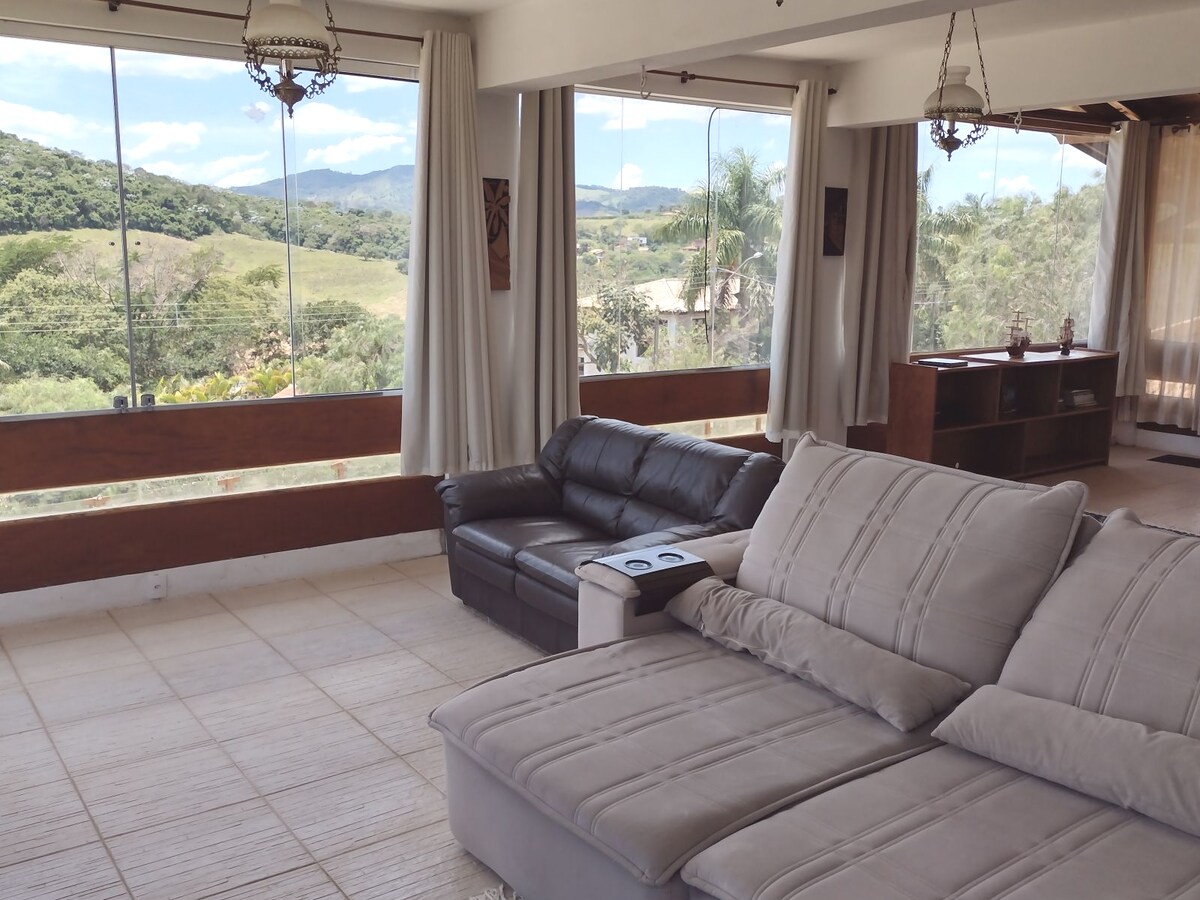 A farmhouse away from the city with a mountain view and lots of nature around. Perfect place to rest and watch the sunset. It has a river with a waterfall inside the property accessed by a trail. Large swimming pool, barbecue and pool table. Parking with 4 covered spaces. In the house, the water is heated with electric showers and the kitchen is well equipped (in addition to the gas stove, there is a wood stove. Firewood is sold separately, R$35.00. Radio Wifi. 30Mb speed.