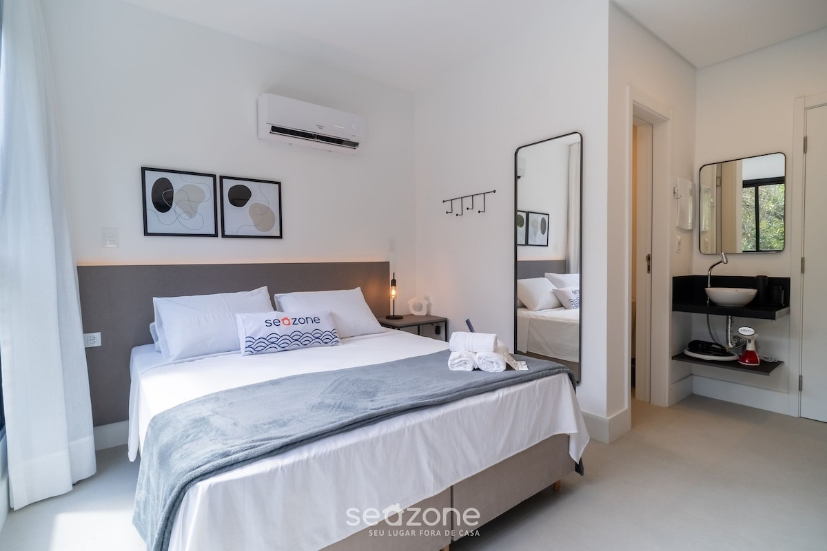 Modern design and an excellent location by the Lagoon! Just 150m from Lagoa da Conceição, this modern studio features a queen bed, Smart TV, air conditioning, equipped kitchen, dining/workspace and Wi-Fi. In the common areas, the building offers a pool and a gourmet rooftop, enhancing the experience. Close to the centrinho, cafés, markets and routes to Joaquina and Mole beaches. Secure your stay and enjoy an exclusive experience!