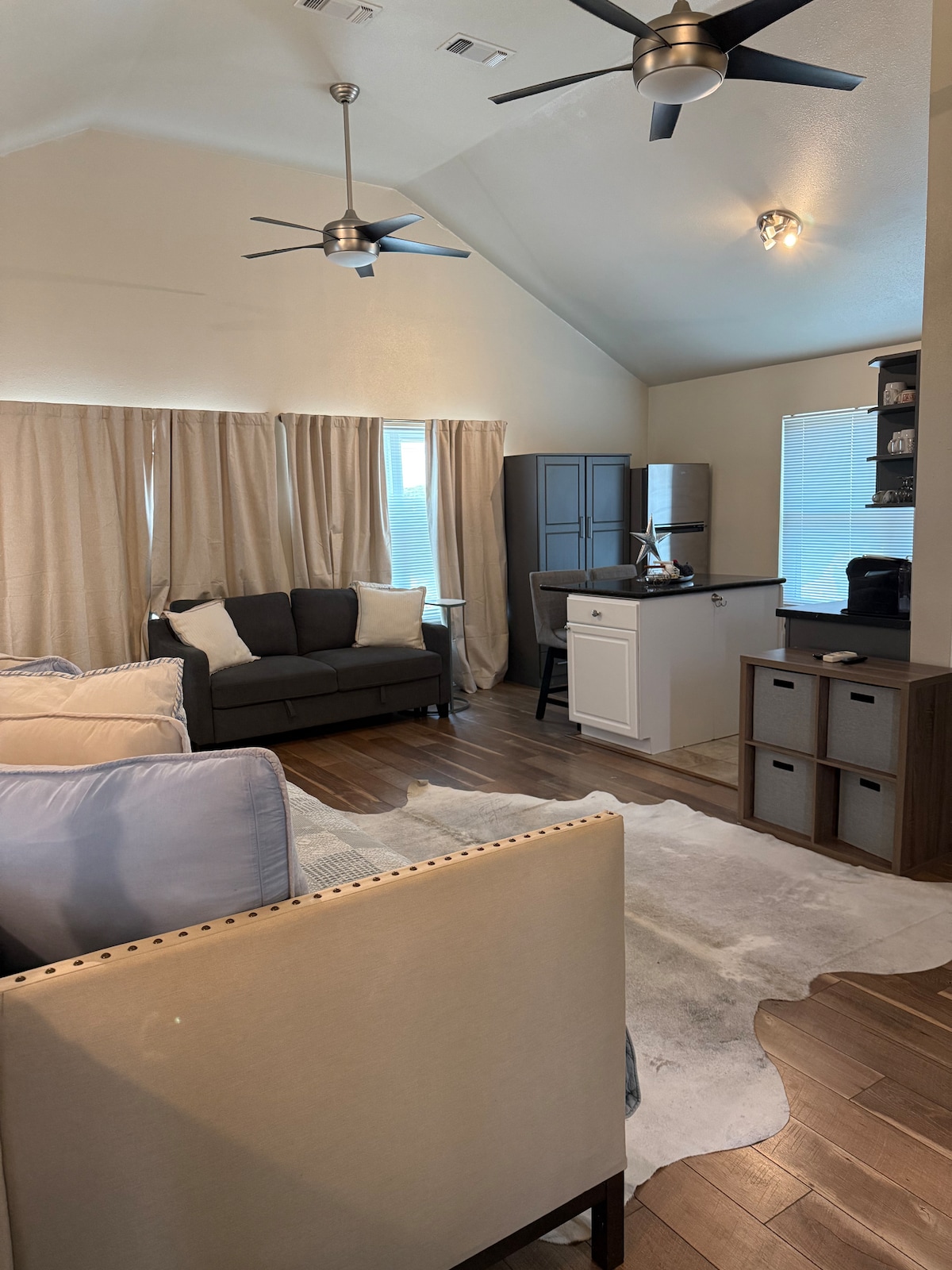 This cozy unit is flooded with light from five huge windows in an airy Victorian gazebo motif. Surrounded by the serenity of live oaks, you'll surely want to stay longer! And amenities! Only a short walk or drive away are our very own Starbucks, Planet Fitness, H E B grocery store, and great library. A few blocks away you'll find a plethora of restaurants, banking, shopping, and walking. But tucked into our green, generously fenced property, you'll feel the peacefulness of country living.