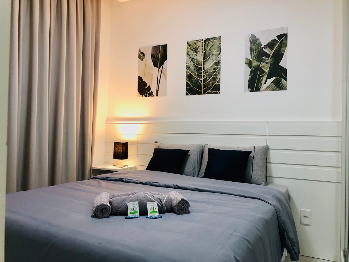 Located near downtown, 5 min from Mueller Mall, in a quiet and wooded neighborhood, with bars, restaurants and easy access to BR 101, is this complete apartment with 43" Smart TV, split air conditioning, Queen bed, washing machine, balcony, gas shower, very well equipped kitchen and TV room. The place also has 1 parking space at no additional cost, a swimming pool, gym, party room, toy library and convenience store. All this in a charming and elegant building!