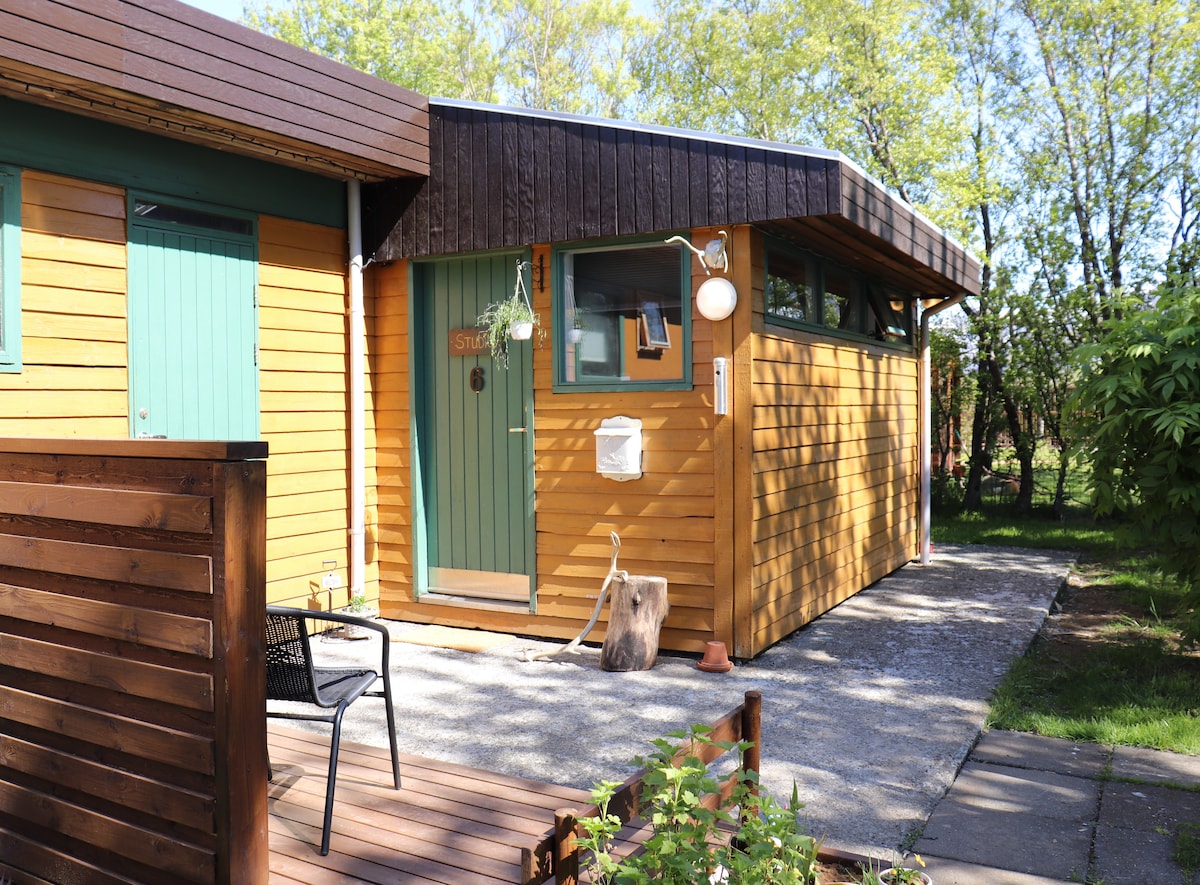 Escape to a charming small cabin nestled in the heart of a landscape dotted with enchanting pseudo craters near Kirkjubæjarklaustur. This cozy and peaceful retreat is perfect for nature lovers. The open studio space is thoughtfully organized, offering a kitchenette where you can prepare your own meals. Ideal for two adults, the cabin features a comfortable double bed and a bathroom with a shower. Enjoy the serene natural surroundings from your private terrace.