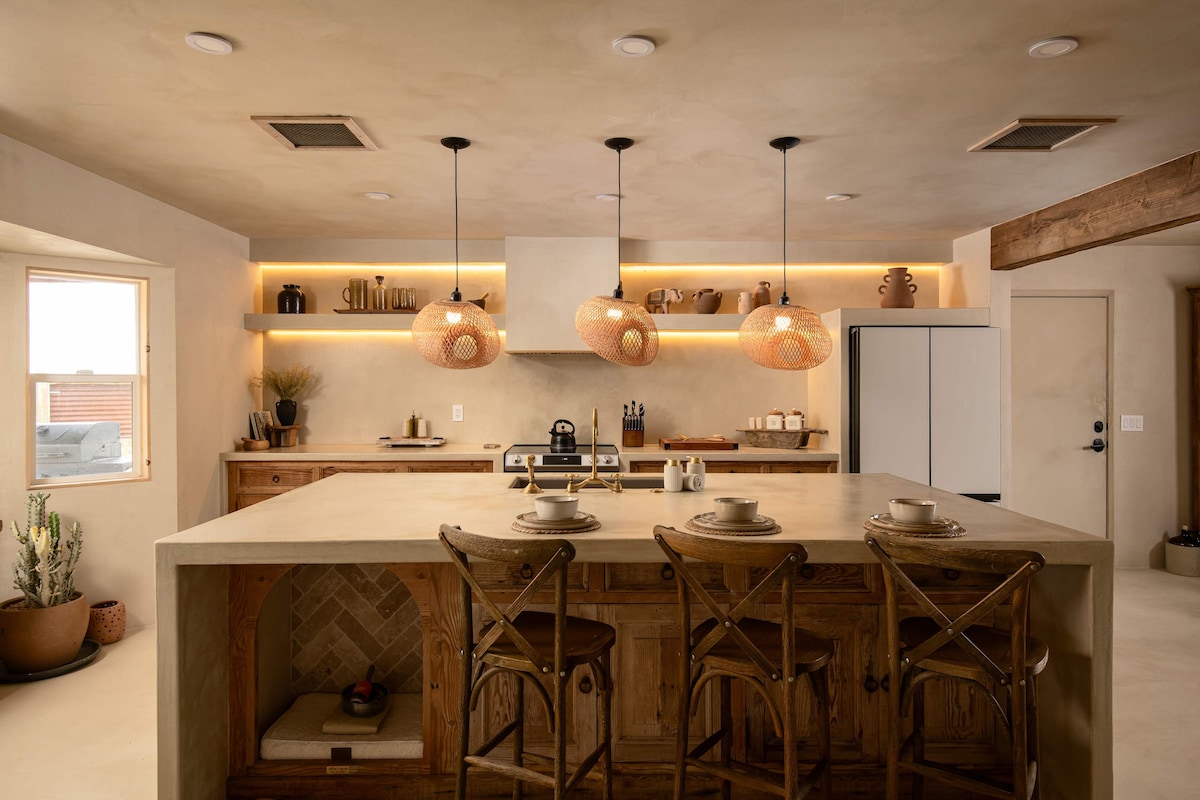 “Sphere In The Rocks” desert retreat w. cowboy pool, jacuzzi, fire pits, daybed, dining & BBQ! ★ “A magical space that encourages connection, reflection, and presence.”❤️ ✔️Architectural sound healing sphere ✔️ Recommendations → Concierge Chef & Sound Bath (ask us!) ✔️Fully equipped + stocked kitchen ✔️Reverse osmosis water filter ✔️Parking → driveway (4 cars) ✔️50 Mbps wifi + workspace ✔️Outdoor shower + tub + fire 3 mins → Joshua Tree National Park Entrance 10 mins → Downtown Joshua Tree