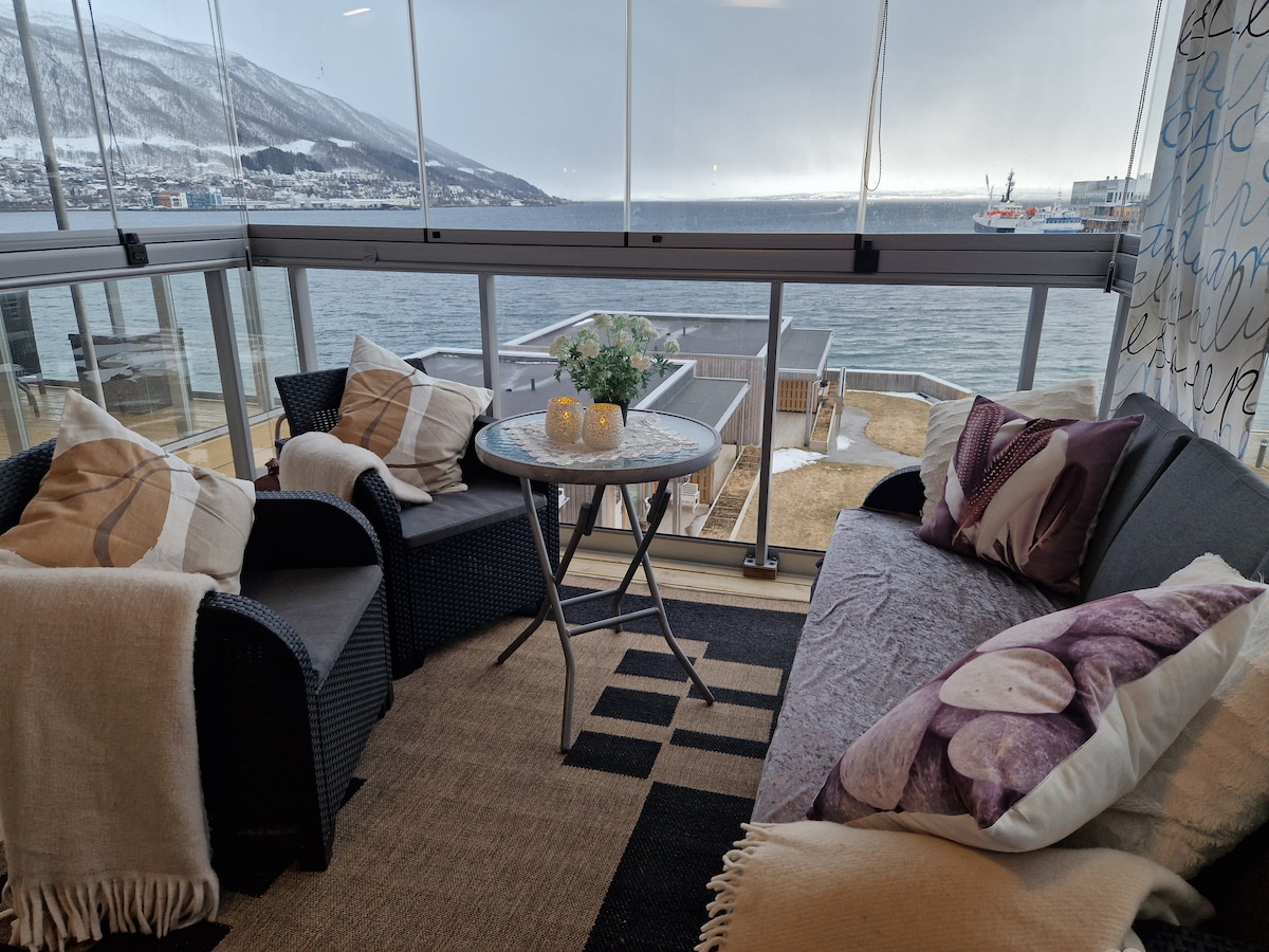 Stylish top-floor apartment by the sea in central Tromsø with an impressive view of the Arctic Cathedral, Tromsø Bridge, Cable car, midnight sun and the Northern Lights. Enjoy Hurtigruta sailing in from the sofacorner and hear waves lapping outside. The entrance is part of a glazed terrace with views to the south. The center is a 10-minute walk away. The apartment is open, inviting, and a nice & comfortable place to spend your time. Age limit to rent: minimum 25 years. NO SMOKING OF ANY KIND.