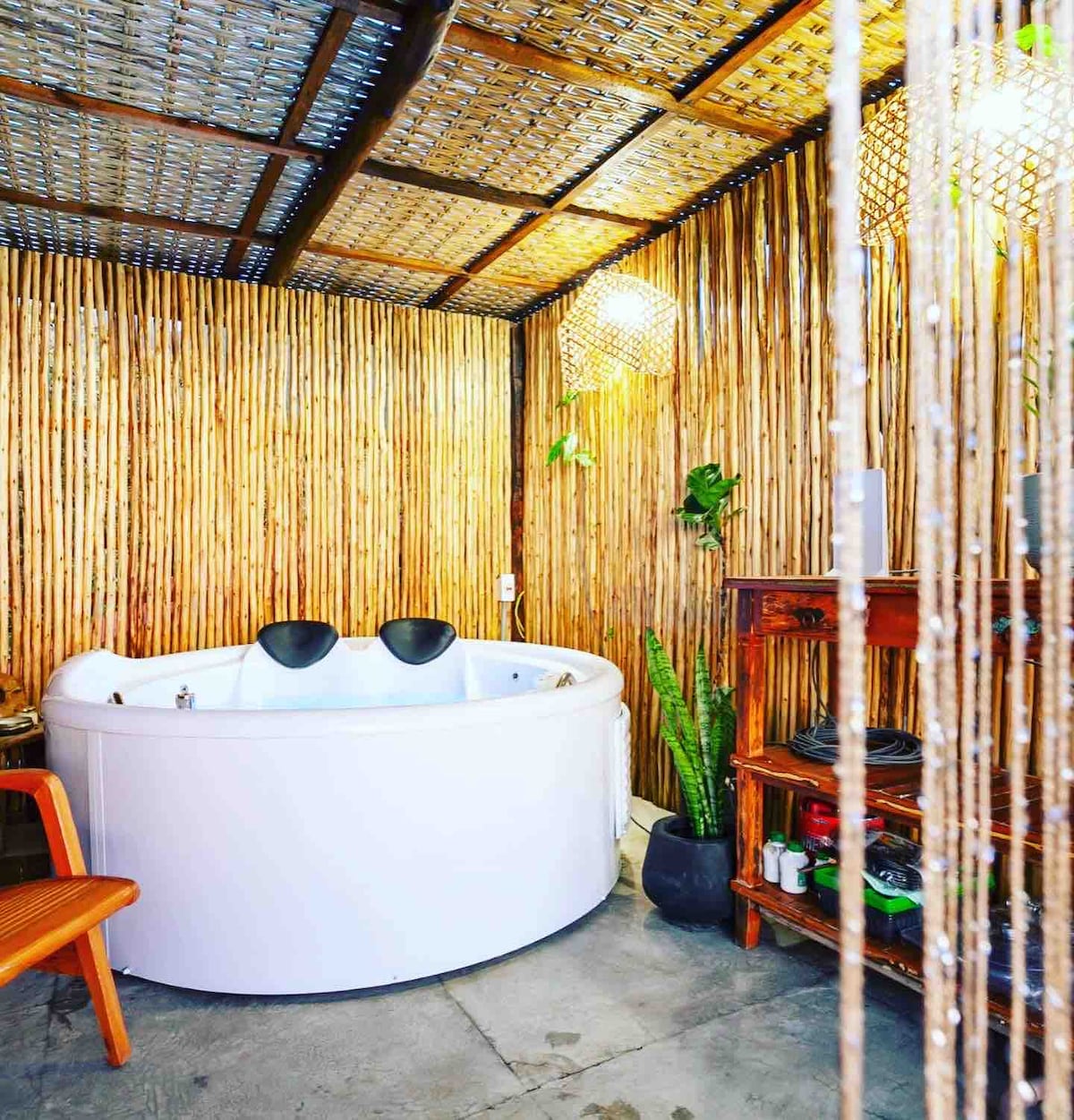 A bungalow built artistically in every detail... a bathtub open to the woods with a glass ceiling gives the feeling of being immersed in nature, with a centenary fig tree in front and many birds... intimate and welcoming in connection with Nature, in contact with this reserve area of the Atlantic Forest. The other hot shower is on the deck open to the woods and is delightful day or night, with a starry sky and moonlight.