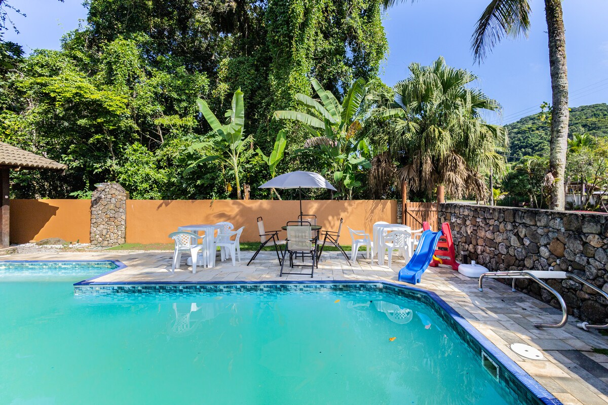 The house is ideal for those looking for a place to relax and love nature. Quiet beach, 24-hour security, located between Riviera and Juquehy. The space is located 500 meters from the beach, with easy access, flat streets and sidewalks. Single-story, airy, dry house, receives sun all day, has a private pool, large garden, barbecue and wood oven. A pleasant space to enjoy with family and friends. Winner of the decoration award.