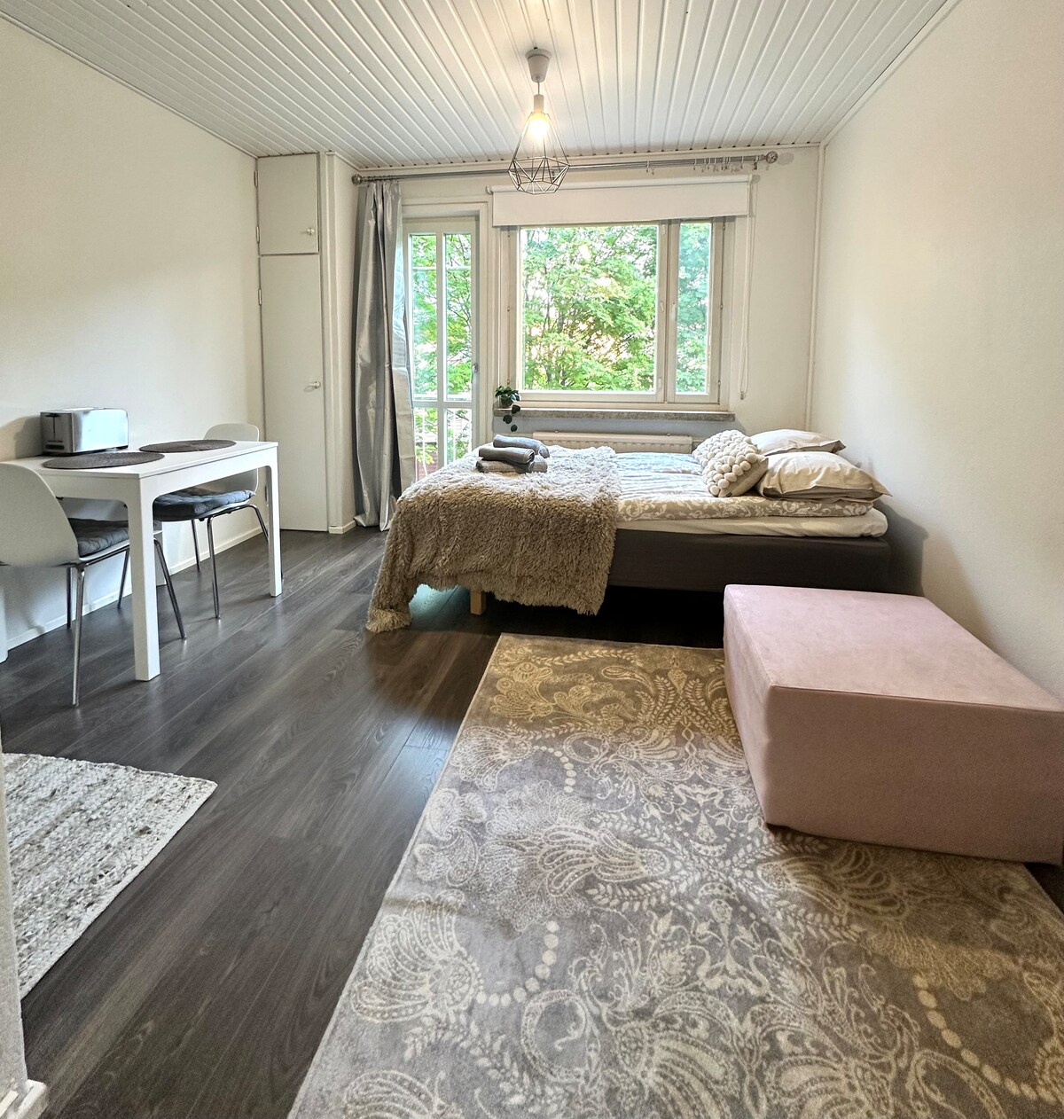 Entire studio available. Living room and kitchen in the same space, small bedroom/sleeping alcove and bathroom with sauna. Quiet area, views of the forest from the balcony. Good outdoor opportunities, direct access from the front door to the Jyväskylä waterfront and beach. Easy access to the city center, pavilion, exhibition center and university. The nearest grocery store is about 500 meters away.