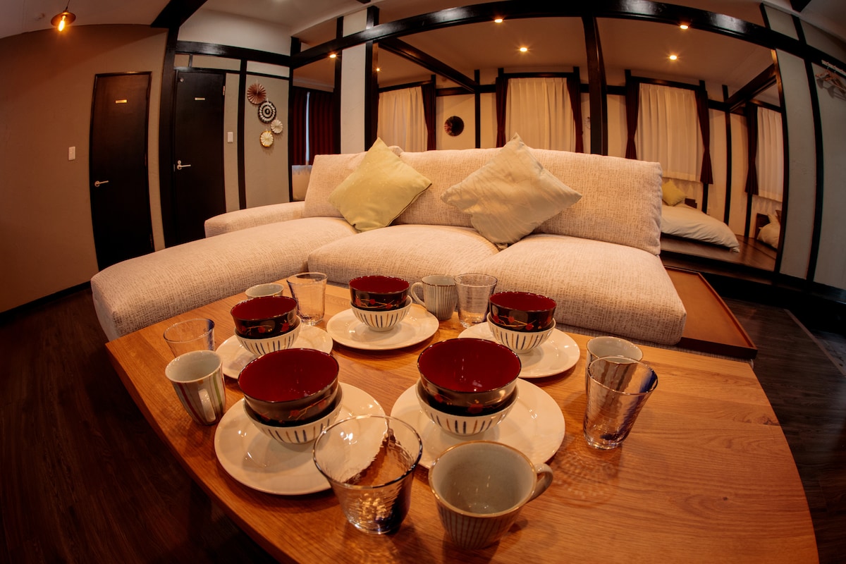 オーナー自ら素材、色にこだわり、デザイン、リノベーションしたお家です。人それぞれに個性があるように、それぞれのお部屋に、それぞれのカラーがあります。広々としたリビングは、桜の襖を立てるように紫の漆喰で和と洋のコラボ!日本には欠かせない和室の畳の間も、漆喰壁、襖の果てからすべてこだわり施工しました。 We design and renovate this house sticking to materials and colors.There are 4 guest rooms in this guest house.Each person has each personally and there are also different colors in each room. The wide living room with purple plaster matches slide doors of Sakura.We made this tatami room for you to relax with green and imagine nature of yore.