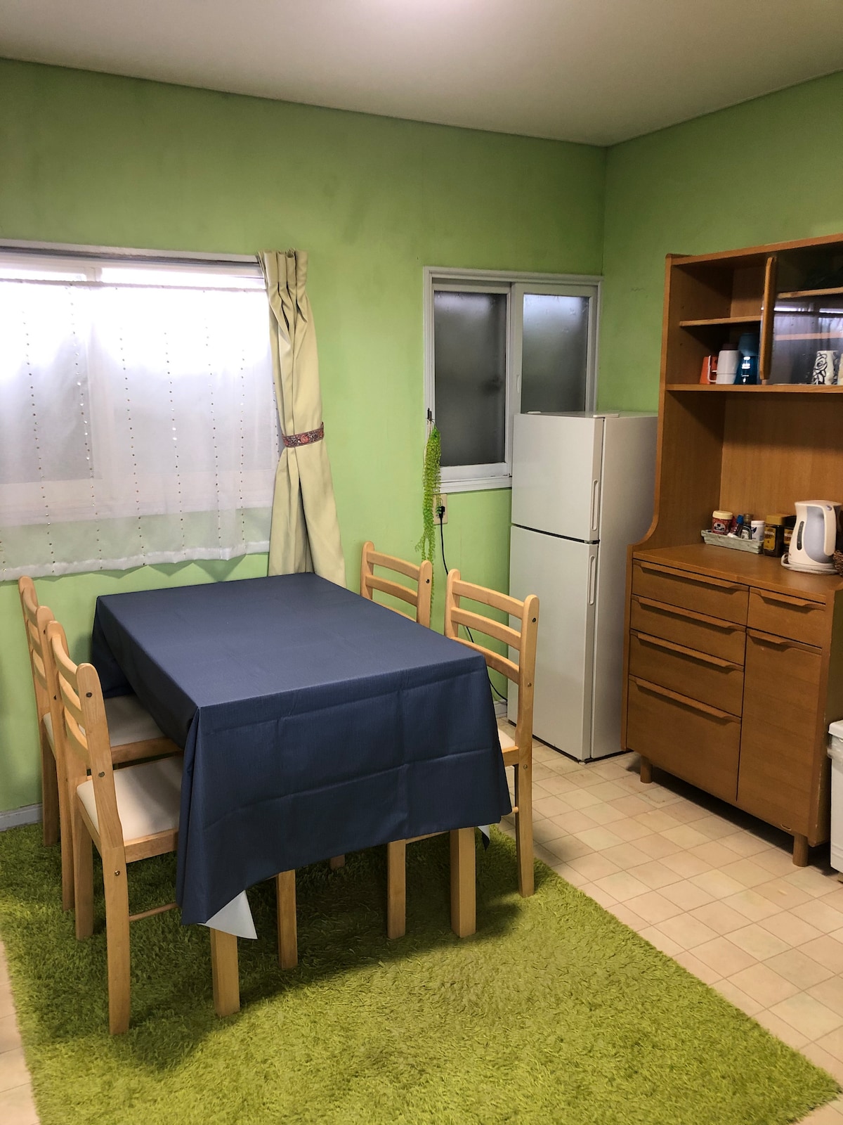 オーナー自ら素材、色にこだわり、デザイン、リノベーションしたお家です。人それぞれに個性があるように、それぞれのお部屋に、それぞれのカラーがあります。広々としたリビングは、桜の襖を立てるように紫の漆喰で和と洋のコラボ!こちらのお部屋は、グリーンアップルをイメージ!フレッシュで爽やかな雰囲気をお楽しみ下さい!We design and renovate this house sticking to materials and colors.There are 4 guest rooms in this guest house.Each person has each personally and there are also different colors in each room. The wide living room with purple plaster matches slide doors of Sakura.I imagined this room green apples.Enjoy this fresh and pleasant green!