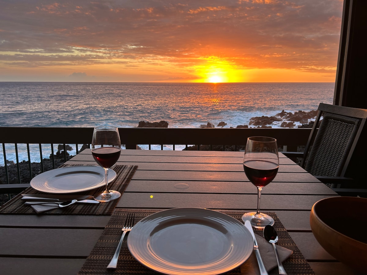OCEANFRONT Kanaloa 3Br 2+1/2 Ba AC SPACIOUS 2000 sq ft. FREE Parking. FREE Resort Fees. FREE AC. Enjoy Meals Out on your Oceanfront Lanai. King Beds. Twins avail. Walk to Keauhou Harbor (Snorkel Tours, Manta Ray Boats), Secret Cove (Hee'eia), Movies, Market, Restaurants 5 min drive to Kahaluu 3 Pools, Hot Tubs, BBQs, Clubhouse, Oceanfront walkway, 16 Acres of tropical grounds. 15 Stairs 2 night min $298 cleaning & 17.96% Hawaii tax is shown on your Airbnb quote.
