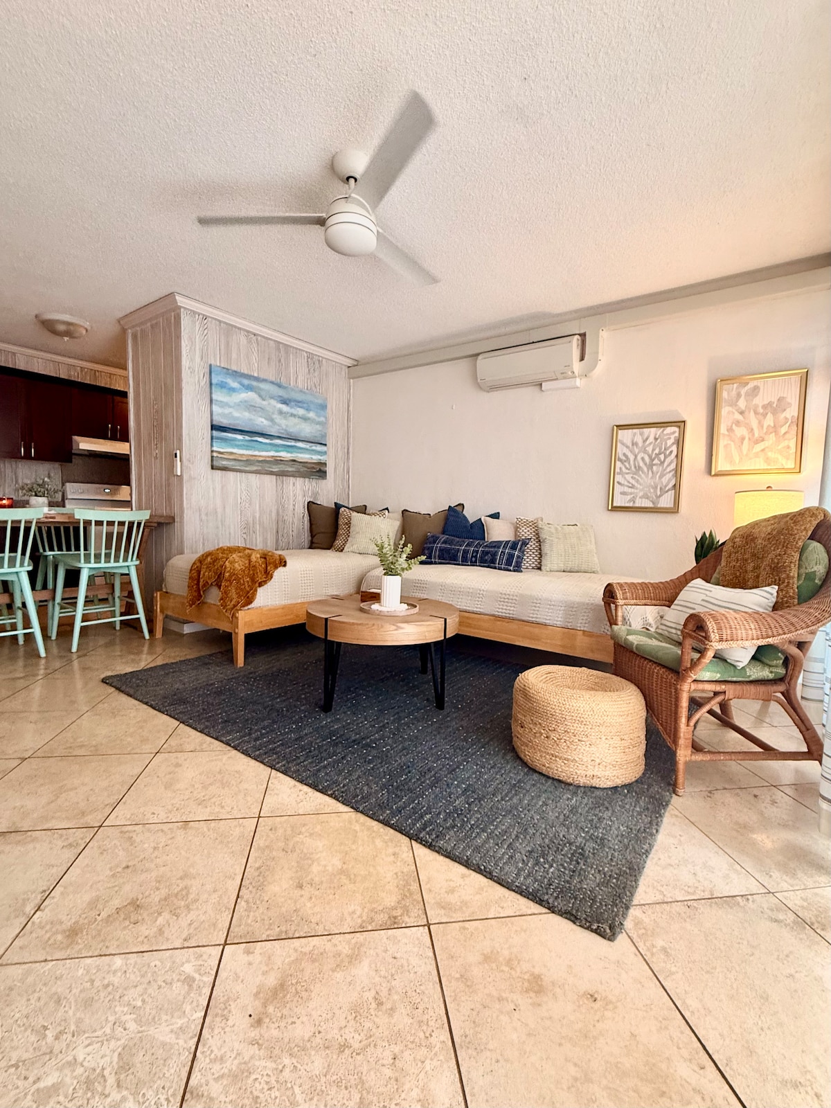 Our Clean & Classy Suite is a beautiful, renovated 445 SQFT studio suite that is located in the popular Kihei Bay Surf condominium. Centrally located, our classy suite is just steps to the beach, and only 15 minutes from Kahului Airport. Our modern studio provides a stylish, relaxing and immaculately clean vacation space. The suite comes equipped with an incredibly comfortable queen sized bed, a cozy sleeper sofa, and everything else you would ever need to feel right at home.