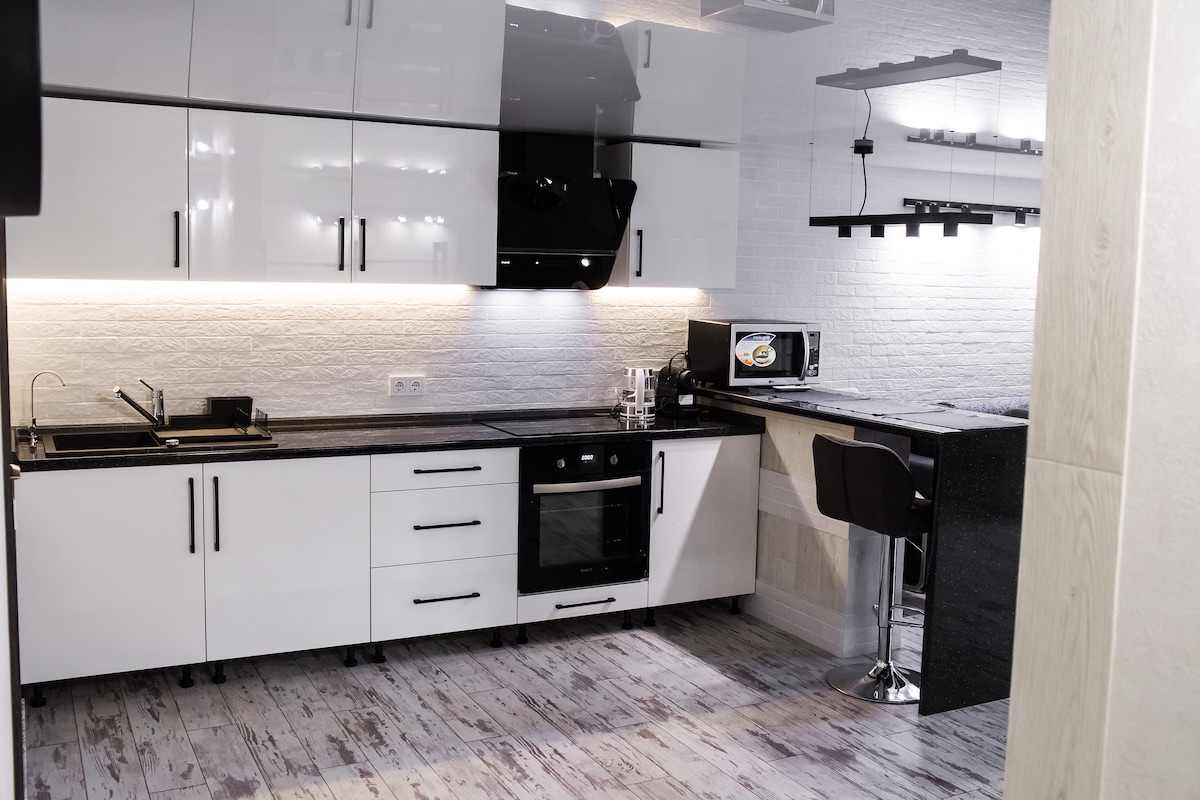 Чудові апартаменти в центральній частині міста. У нас поряд є багато магазинів, кафе, аптек, кінотеатр, дитячий розважальний комплекс, зупинки міського транспорту. Кімната із двохспальним ліжком та зручним диваном, повністю обладнана кухня, окрема ванна кімната з душем та пральною машиною. Апартаменти укомплектовані всім необхідним для комфортного проживання: Wi-Fi, телевізор з плоским екраном, мікрохвильова піч, варильна поверхня, духова шафа, холодильник, фен, праска. У дворі є парковка.