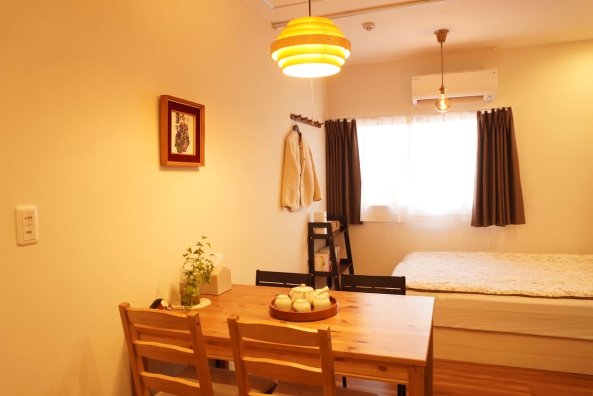 【Japan 8】2楼2号房源 (无电梯) 和风雅居•现代日式 这套客房距离天下茶屋(Tengachaya)地铁站步行5分钟,有南海线和堺筋线两大主要地铁线路,可轻松前往难波商圈、天王寺商圈、日本桥商圈、梅田商圈和关西机场等任何景点,是大型的交通枢纽站。 天下茶屋地铁站旁有购物中心,2家大型超市,连锁药妆店。 有很多美味的早餐店:著名的Mister Donut甜甜圈店,连锁View De France面包店,McDonald's和KFC。 日本连锁套餐店YAYOI 、乌冬面馆、中餐馆,“一斗”烧肉店,人气寿司“くら寿司”、Big Boy 牛排馆等多家餐饮店和居酒屋;商店街。多家便利店(711、罗森、全家)等供您选择。 交通和生活非常便利。 这套2号房源位于2楼(没有电梯)。 • 日式与现代融合的沉静氛围 • 榻榻米风区 + 双卧室,非常适合家庭 • 脚踩榻榻米的触感、木制和纸的温度 • 低饱和的灯光让时间变得慢慢而温柔 • 适合读一本书、写日记、发呆、睡个长觉 外面是旅行,这里是心的休息站。