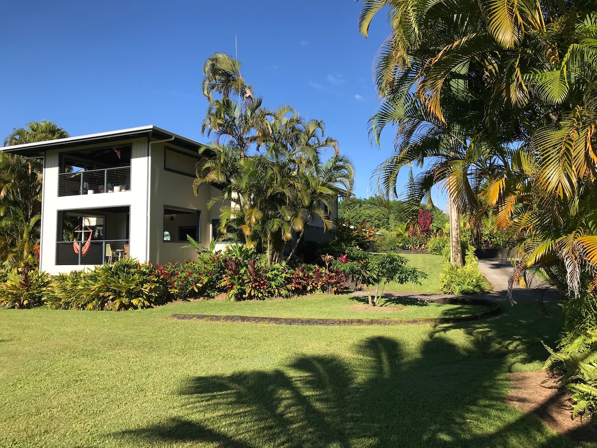 NESTLED🌴 privately amongst towering palms & vibrant tropical foliage, our tranquil suite is perched in a sanctuary of native Ohi'a rainforest EXPLORE🌋 black sand beaches, wild jungles, volcanic hot ponds & Hawai'i Volcanoes National Park ZEN 🎋 daily with nature: dine & relax in the fire pit lounge amidst sights & sounds of the forest on the screened-in lanai REFRESH💦 pristine rainforest offers a harmonizing balance of sun & rain with cooler coastal elevation temperature averages of 83H-65L