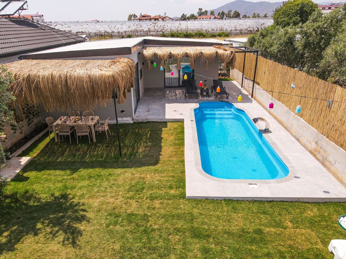 Our villa, located in the center of Fethiye, is 3 km from the center of the bazaar, 10 km from the world-famous Ölüdeniz and 3 km from the Çalış beach. It has a private pool and a children's pool. Our villa, which has a large garden and a barbecue in the garden, has a floor heating system and a comfortable heating facility with a heat pump. Free Wi-Fi and a baby bed are available. Long-term monthly rentals are available.