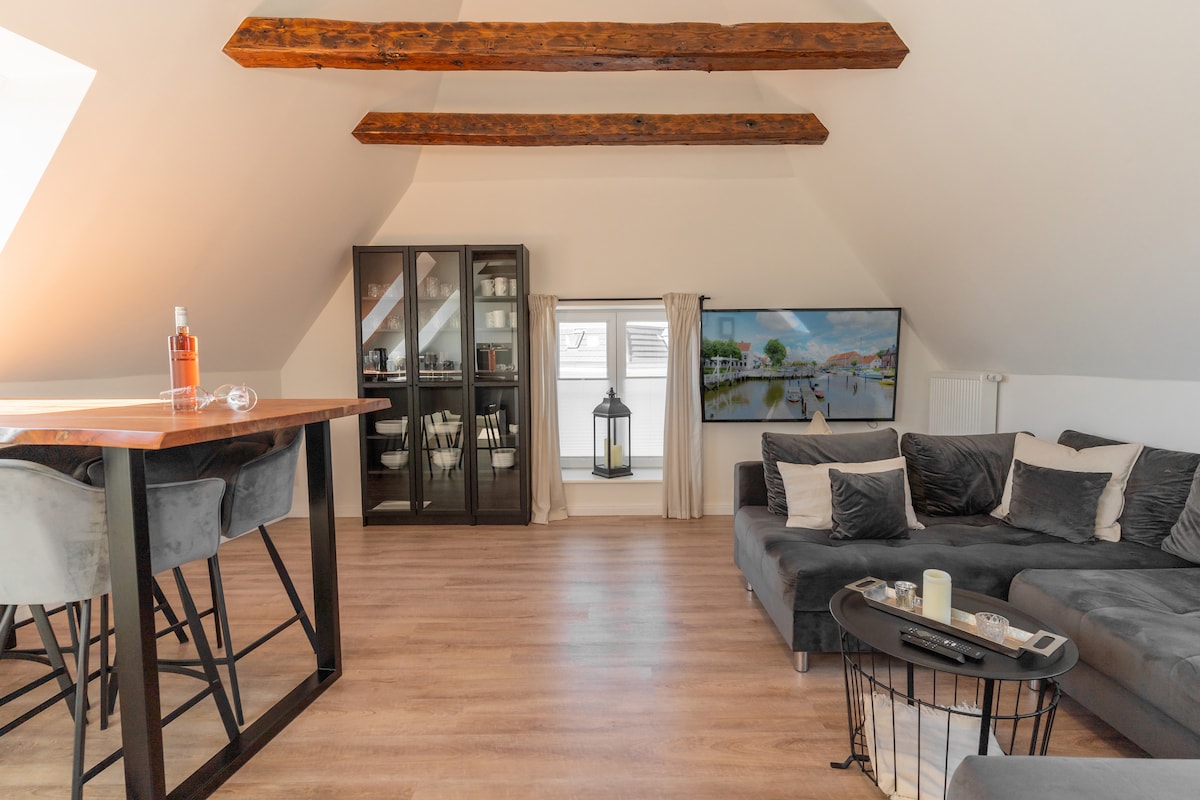 Liebevoll und durchdacht haben wir mit ganz viel Herzblut eine traumhafte Ferienwohnung auf 70 qm für 2 ( bis 4) Personen auf 2 Ebenen geschaffen- im lichtdurchfluteten Obergeschoss befindet sich der Schlafbereich. Bitte beachte, dass die einzige Tür die Badezimmertür ist- der Rest ist offen. Wir haben versucht möglichst nachhaltig, ökologisch und hochwertig zu bauen - die Farben sind von Kreidezeit, die Lacke auf Wasserbasis.