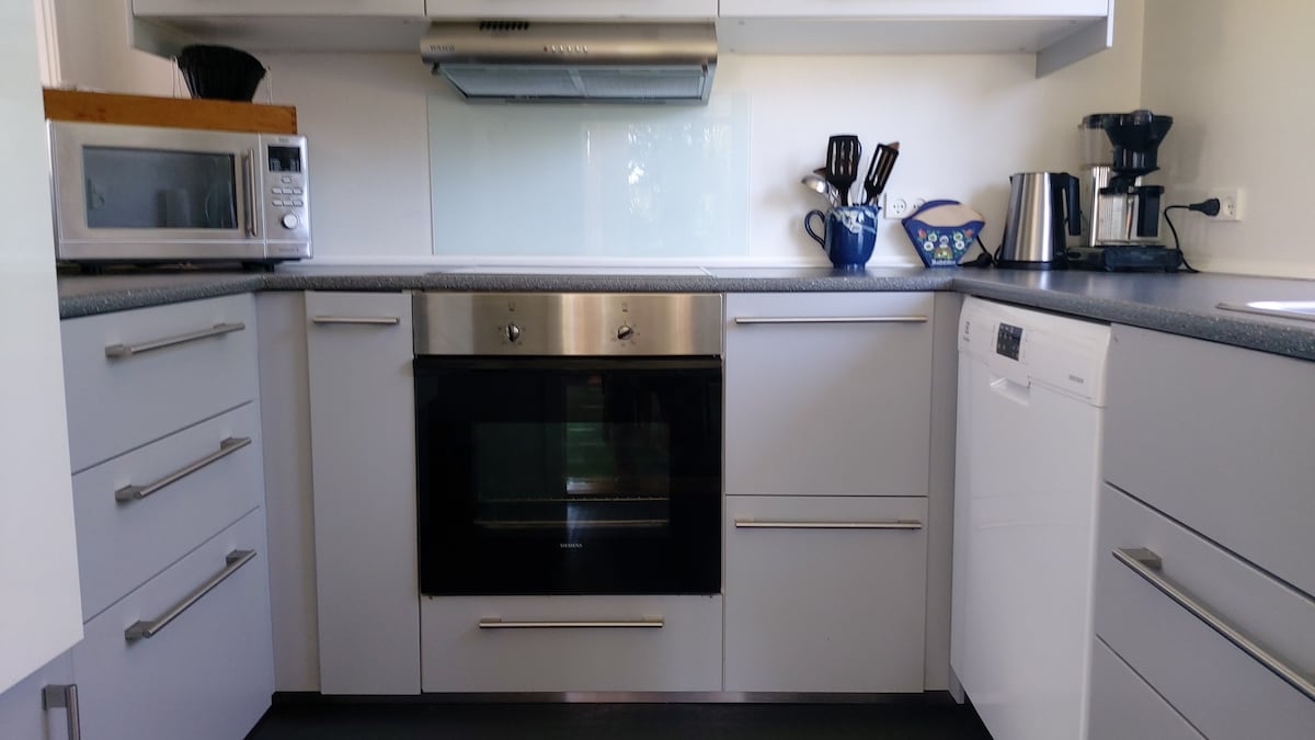 The apartment is on the 1st floor of our house, we live in the opposite end in the living room. It contains: 1 toilet with shower, a kitchen with stove/oven, hood, coffee maker, electric kettle and refrigerator with small freezer. The kitchen contains all the service you need. 1 bedroom with double bed, dresser and clothes rail. Living room with TV, 2 armchairs and sofa (which is also a sofa bed). Kitchen, dining area, living room and "entrance" are all in one. In the living room, there is a TV with DVD and Chromecast, and of course you also have access to the Fibia network.