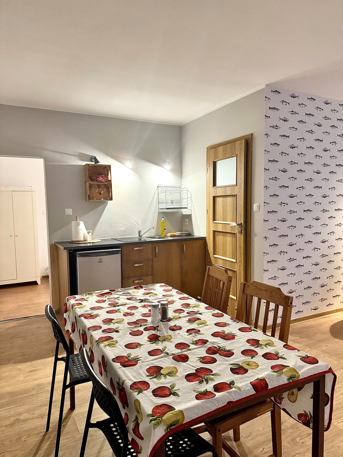 A separate apartment on the 1st floor of a house with a separate entrance. Completely separate bathroom and kitchen with full equipment: washing machine, dishwasher, microwave, oven, gas hob, radio, TV, dishes and pots and pans, towels for guests. 2 large rooms with double beds + couch for 1 person. The possibility of adding a crib. In the backyard, swing, sun loungers, barbecue. We offer Kashubian breakfasts for 25 zł/person per night. Pets are allowed after contact and a fee of 15 zł per night.