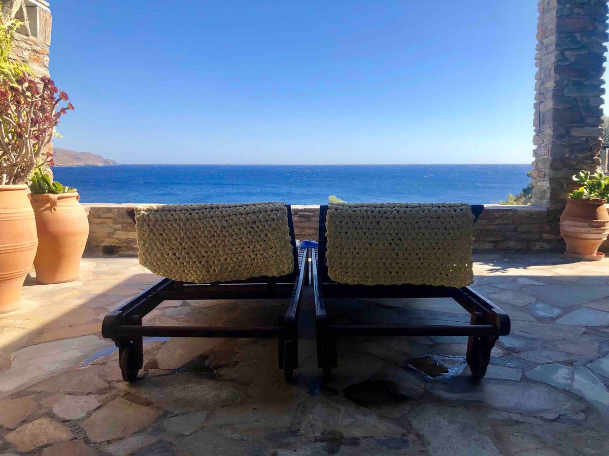 Serene, amazing and not too far from the action. A place for you to relax. 1,3 kilometers from the port, yet isolated & supremely quiet. The beach is 60 m distance from the property & is accessible through the garden. The house is split into two separate levels (Villa Amelia and Villa Agelos). Amelia 's guests have their fully private level, complete with living area, kitchen, 1 master bedroom & toilet, en suite bathroom. They also have their own patios with sea views.