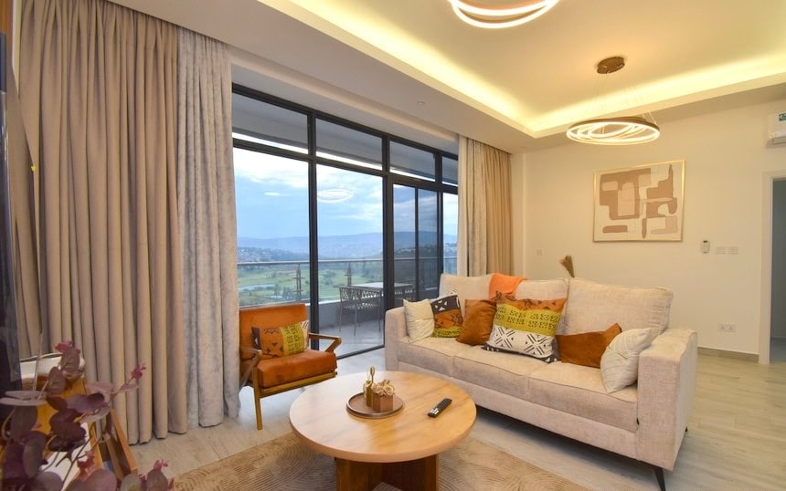 Modern, stylish, air conditioned throughout, newly finished and fully furnished 2 ensuite bedrooms, 2.5 bathroom apartment steps to the golf course. Beautifully furnished with modern contemporary furniture, the space will guarantee a luxurious lifestyle in the best residential neighborhood in Kigali. Some key appliances and fixtures available are: 55" TV screen. Fibre optic internet access Laundry machine Double door refrigerator Inbuilt Oven Inbuilt Dishwasher.