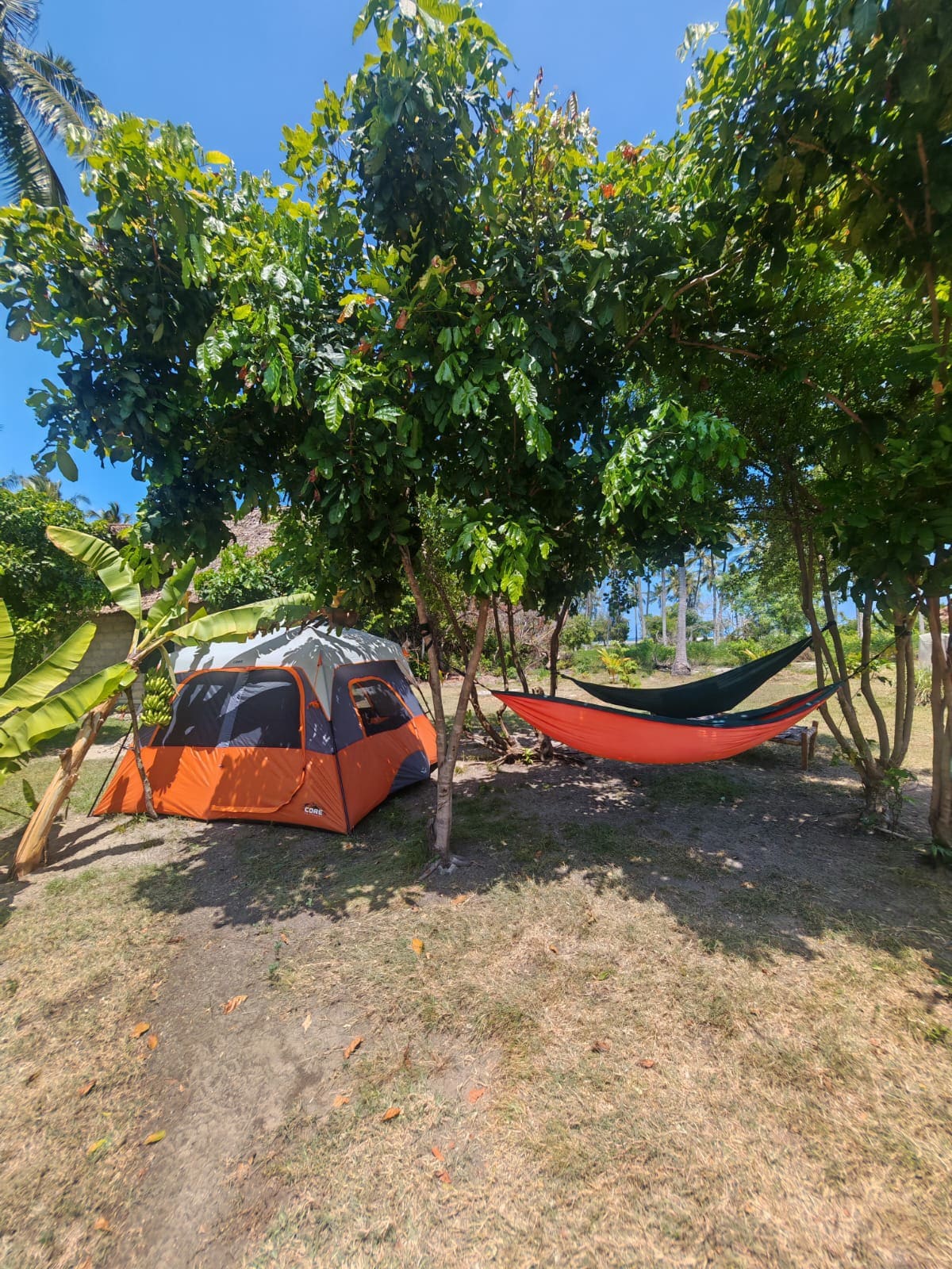 Wake up to the sound of the ocean in this cozy tent just 30 seconds from the beach. The tent sleeps two and comes with a full private bathroom (shower and toilet), an open kitchen, and free parking. Enjoy lazy afternoons in the hammock, dinner under the stars at the outdoor dining area, or evenings by the firepit. The lush garden is dotted with fruit trees—and you’ll get fresh coconut water straight from the source.