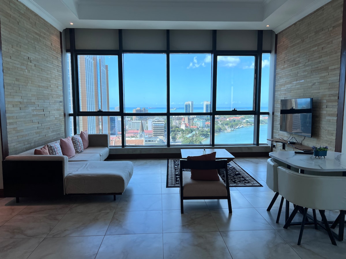 Our 3-bedroom duplex offers stunning views of Dar es Salaam port and city. Spacious and stylishly designed, perfect for families or groups. Three bedrooms, two bathrooms, fully equipped kitchen, open-plan living and dining area, balcony. Master bedroom with king-size bed and en-suite bathroom. 24-hour security, gym, pool. Experience luxury living in the heart of the city. Book now for a comfortable and enjoyable stay.