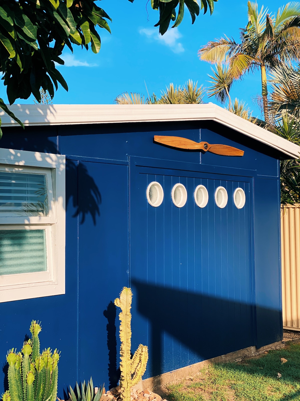 The Hangar is a studio space that accommodates two people. Located a short walk from the beach, it features both coastal & aviation design elements. A separate dwelling to the main house, you'll have access to a private courtyard filled with plants. We are located 1km from the airport, a flat 15min walk and 500m from the beach.