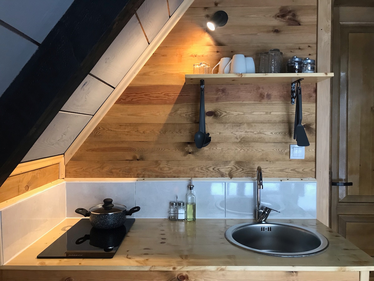 This wood cabin is standing on the top of our property. From this place you have the best view. At every side of the house you can see the mountains on there best. When you look at the pictures you can see that the two-personsbed is only available with a little stairs or you can sleep on the sofa bed downstairs. There is a place where you can make fire and make dinner on a bbq. The terras has a view on the river where we will serve breakfast every day from 1 mei till 1 oktober.