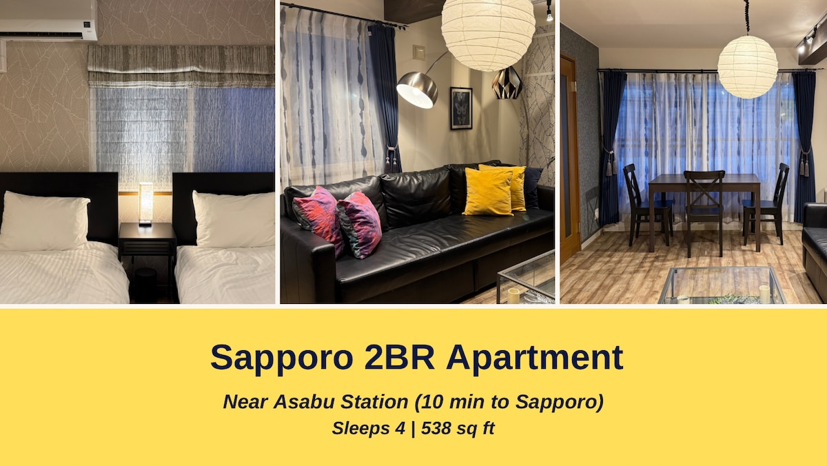 Spacious 538sqft 2BR for 4 guests. A private unit on the 2nd floor. 11m walk from Asabu Stn, 15m from Shinkotoni Stn. Sapporo Stn is 10m by train, 15m by car. Free parking (Reservation Req/First-come basis). Contact us early. Times Car Share on-site (Subject to availability). Renovated bath, new mattresses, 55” TV, AC in all rooms, and Wi-Fi. In-room washer + Baluko Laundry next door. Supermarket/eats in 10m walk. Bankei Ski is 35m drive. No smoking/pets. Perfect for families or long stays!