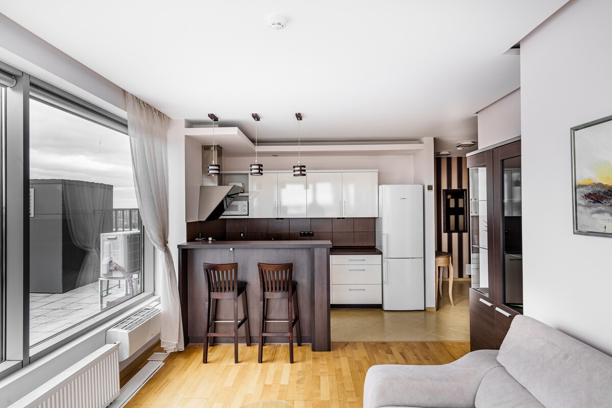This unique 15th-floor apartment features a private 50m² terrace with stunning views of the sea and Klaipėda skyline — perfect for sunsets and morning coffee. Inside, enjoy a fully equipped kitchen, air conditioning, and comfortable sleeping for up to 4 guests. Conveniently located in Klaipėda’s center — Old Town and Švyturio Arena are just a 15-min walk, and the New Ferry to Smiltynė is 1.5 km away. Shops, cafés, and public transport are all nearby.