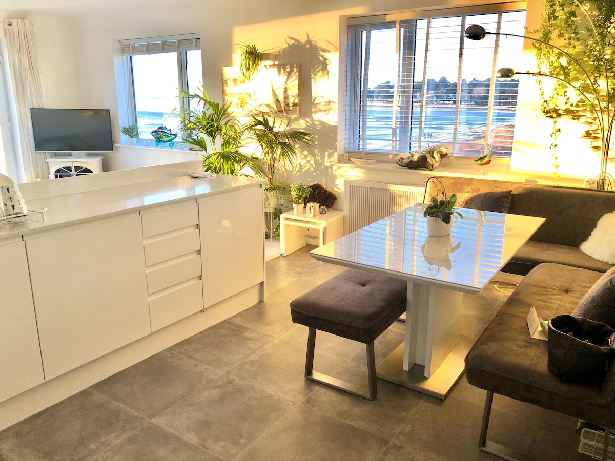 Bright contemporary top floor apartment on Sandbanks across the road overlooking Poole harbour.. Hence amazing harbour views with beautiful sunsets to absorb.. Great place for water sports enthusiasts with hiring facilities right opposite! 7 mile stretch of sandy beaches are a short 2 minute stroll away by Jazz cafe. Bus stops for Swanage/ Poole/Bournemouth.. One Car parking space to the rear of the block is available with apartment.. I will be here to meet guests upon their arrival.