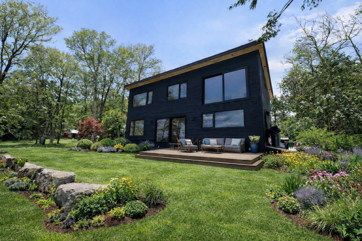 Romantic and private, this 2,000 sf modern luxury cottage nestled on twelve acres is a favorite of honeymooners and lovers of modern design * 1 hour to Acadia National Park & Bar Harbor; 15 min to shopping, hiking, swimming * Stargazing deck * 2 full baths, one with steam shower * Fully equipped kitchen with under-counter fridge/freezer * Two gas fireplaces, one indoors, one on a covered deck * Queen bed with luxurious linens and pillows * WIFI, streaming TV, grill, bar * EV charger