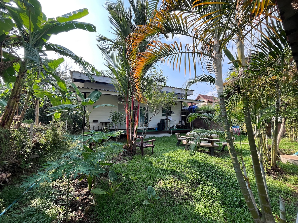 Comfortable bungalow located in a quiet resort, in a garden in Klong Prao, 200m away from the beach and 200m away from the main road. Air-condition, fridge, private bathroom with hot shower, good WiFi, TV with Netflix. Our guests have access to a shared equipped kitchen outside our reception. Cleaning on demand for free.