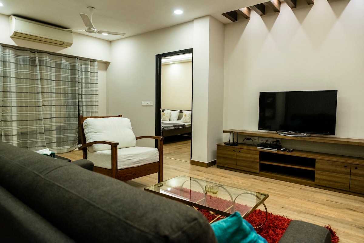 Ebb Is a delightfully bright airy space with a relaxed vibe, it's a serviced two bedroom apartment with a terrace area Located centrally and easy access to all restaurants, malls, hospitals and tourist spots of the city You can choose this stay whether you are in the city for a business trip, a family trip, a staycation,medical stay etc It's located on the first floor with an elevator and 24 hours security and one car parking The zen and minimal interiors provide a blissful feel :)