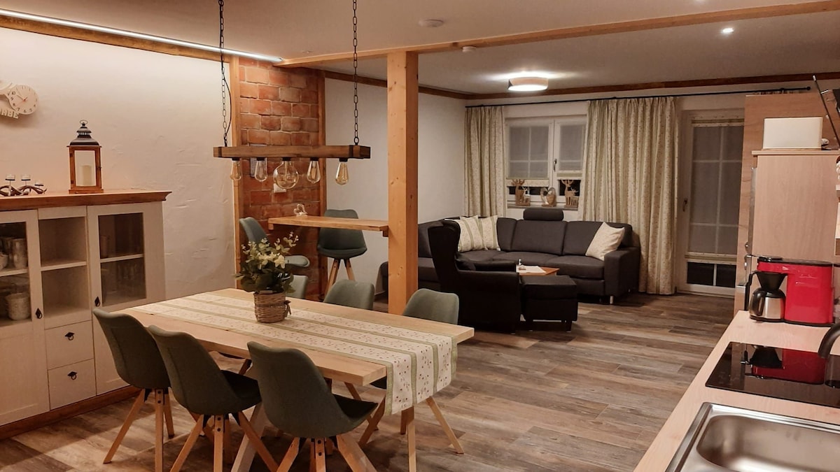 We offer you a semi-detached house with two equally equipped, cozy apartments in a new natural main house with a very special ambience. These two apartments can each accommodate up to 6 people. They have a living area with a fully equipped kitchen, a spacious sofa and a wood-burning stove for soothing warmth. Now you can also enjoy the cottage magic in the wellness parlor with us. This is accessible for both apartments and is located in the basement.