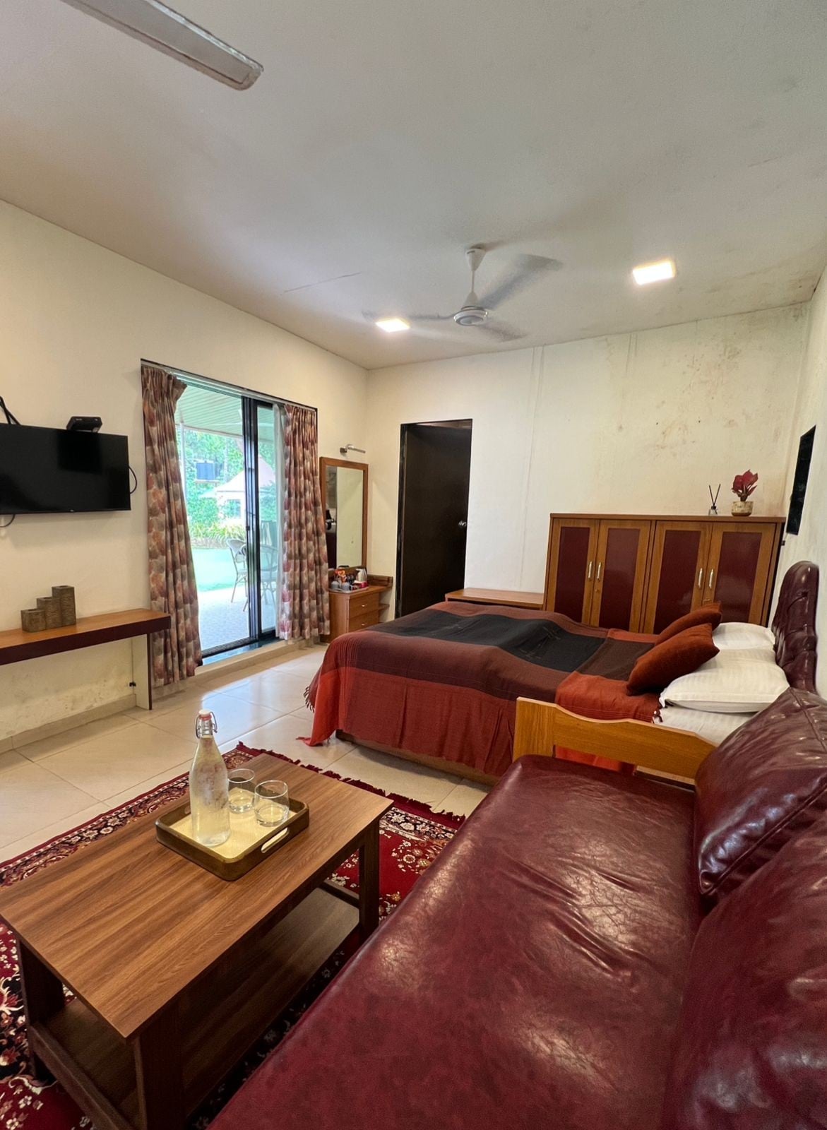 Perfect weekend home!The best part about Satin Resorts & Chalets is that an entire 1BHK chalet is YOURS, for a weekend. This means you have the luxury of spending your time in this beautiful home without missing yours.The entire chalet has glass doors all around, giving you the best views of nature. A private garden, right in front of your living room, is an added bonus. The bedroom is cozy and the bathroom is Good