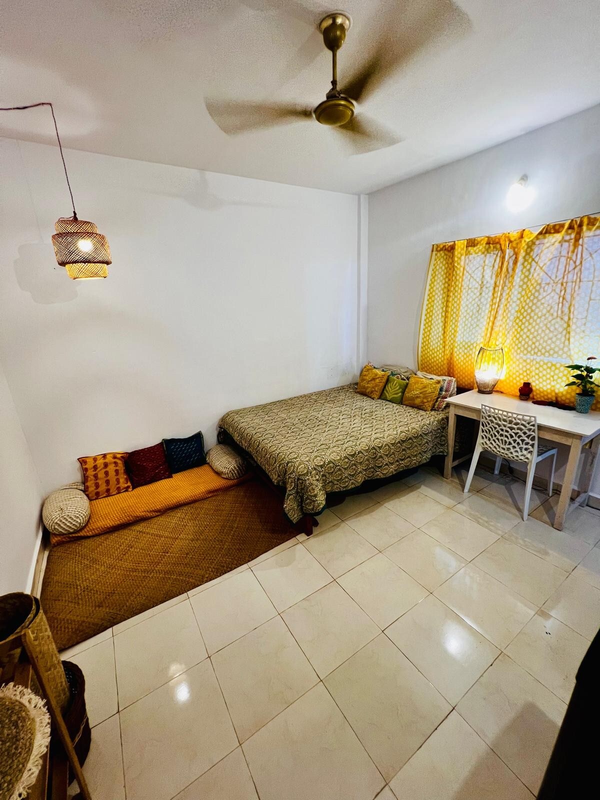Cute & Cozy Riverside Studio in Siolim, Goa This charming yet spacious studio is centrally located in Siolim, right next to the river, and just a 13-minute drive to the sandy shores of Morjim Beach. Grocery stores and restaurants are only a 5-minute walk away for your daily needs. Popular spots like Thalassa, Kiki by the sea and other well-known party venues are only a 10-minute drive, making it perfect for guests who want to enjoy both calm mornings and lively evenings.