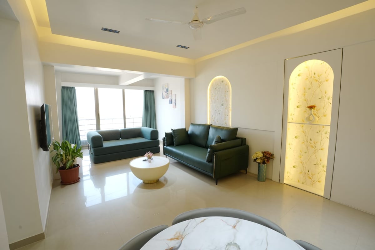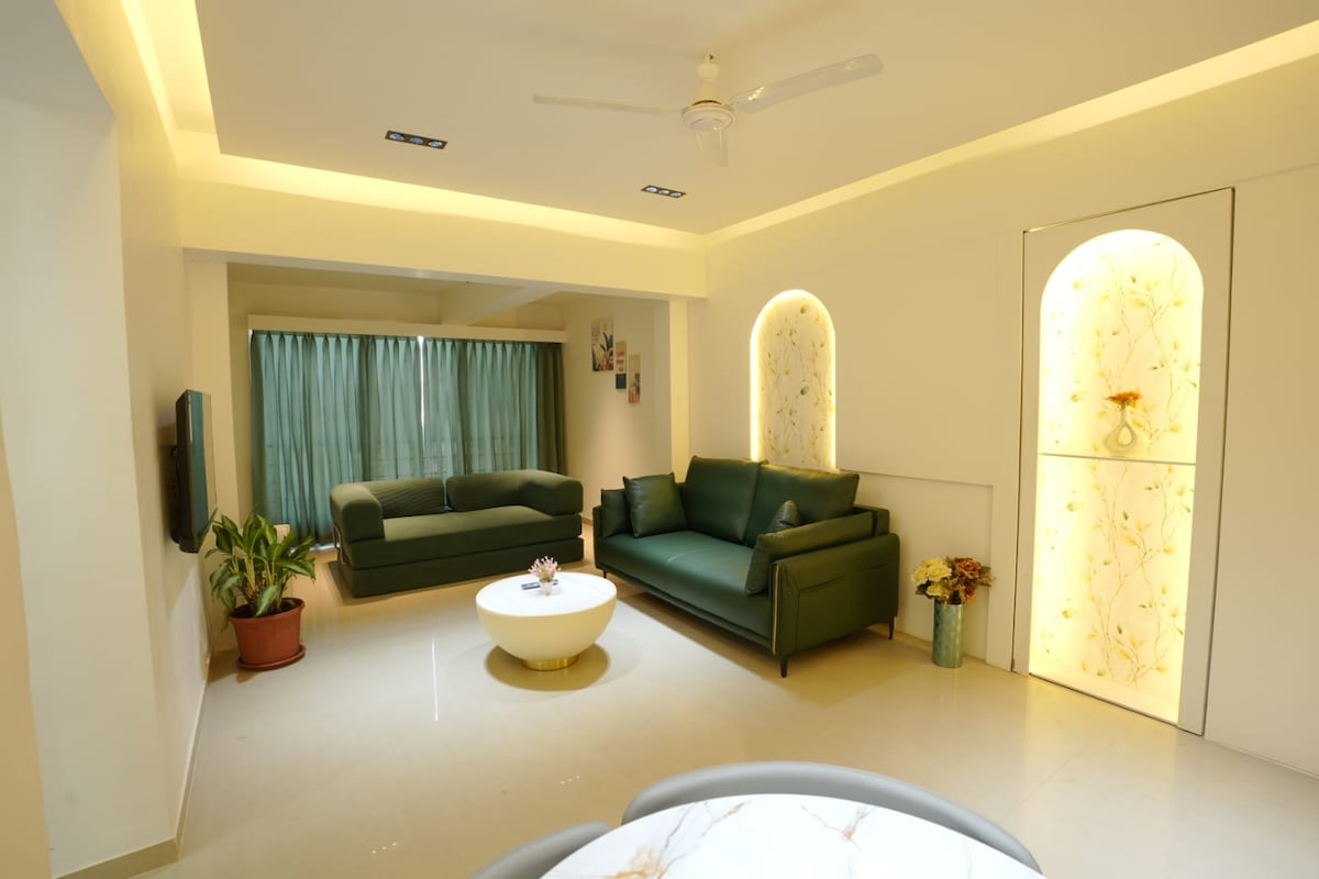 Premium 1.5 BHK apartment (850 sq ft) at Ekta Green Ville, Nashik, located just behind Radisson Blu Hotel & Spa Nashik. Fully furnished with king bed, sofa-cum-bed, 2 bathrooms, AC, WiFi, Smart TV, microwave, induction, coffee maker, and dining setup. Ideal for 2–4 guests. Peaceful society with lift & parking. Perfect for family stays, business trips, and weekend getaways.