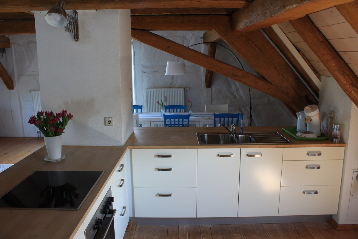 Our attic apartment is somehow special. It has a fully equipped kitchen. You can make yourself comfortable here on beanbags. In the morning, enjoy a fantastic view of Lake Constance with a cup of coffee on the balcony.