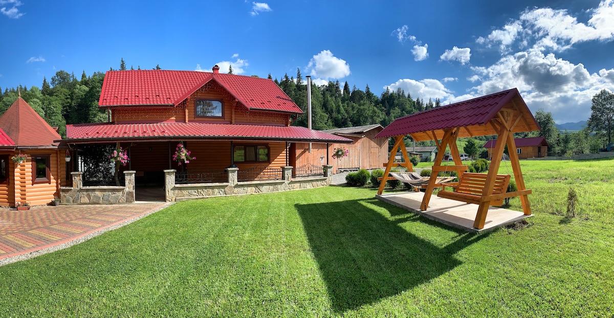 Здається деревяний Котедж , басейн , сауна, відпочинковий зал ,, супутникове ТБ, WI-Fi , Безкоштовна парковка для авто , Кухня , холодильник, електрочайник, столовий та чайний сервізи, та багато чого іншого. 3 спальні (4 двохспальні ліжка), 3 санвузли (душова кабіна у кожні кімнаті, унітаз, умивальник), кількість рушників – 2 на особу. Балкон з видом на гори . За Додаткову Оплату є Кухар який може готувати для вас.