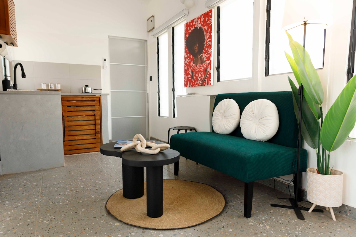 Welcome to Alaya’s. A studio situated in a large garden. Indulge in a spacious bedroom & light-filled living area in this modern outer house. Walk 10 min to Labardi and Laboma beach, a min to the cafe. 5-10 min drive to restaurants, coffee shops, and a supermarket. Perfect for families or professionals. It features a fully equipped kitchen, AC throughout, high-speed WiFi, elegant décor, & luxury toiletries.