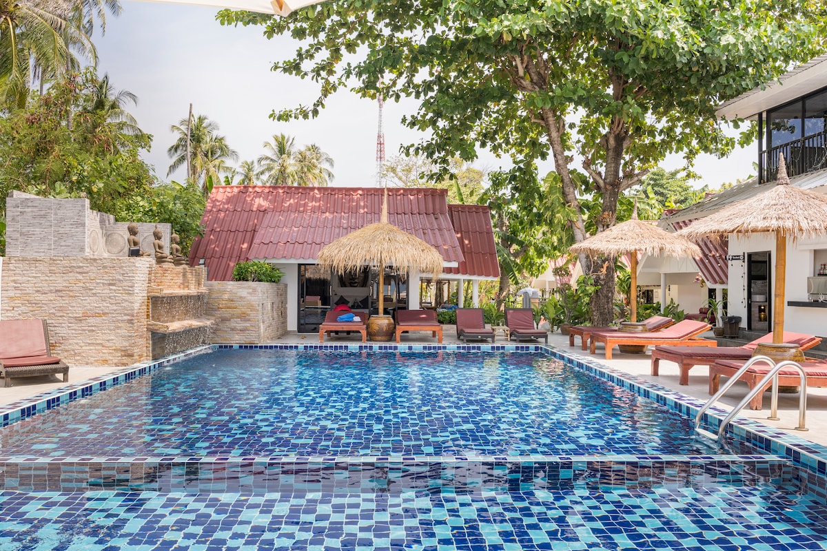 Private Beachfront Pool Villa, natural style and designed bamboo roof nestled in a lush tropical garden and private beach. Let's feel the Siam and Bali vibes. 2 aircon bedrooms, 2 bathrooms, huge tropical romantic bath and jungle sky shower, semi-open roof to enjoy the stars at night. All is handmade and designed. Semi-open living space, kitchen, table, big sofa and laying nets, creating perfect spots to chill at every moment of the day. Welcome to your next tropical and luxury experience.