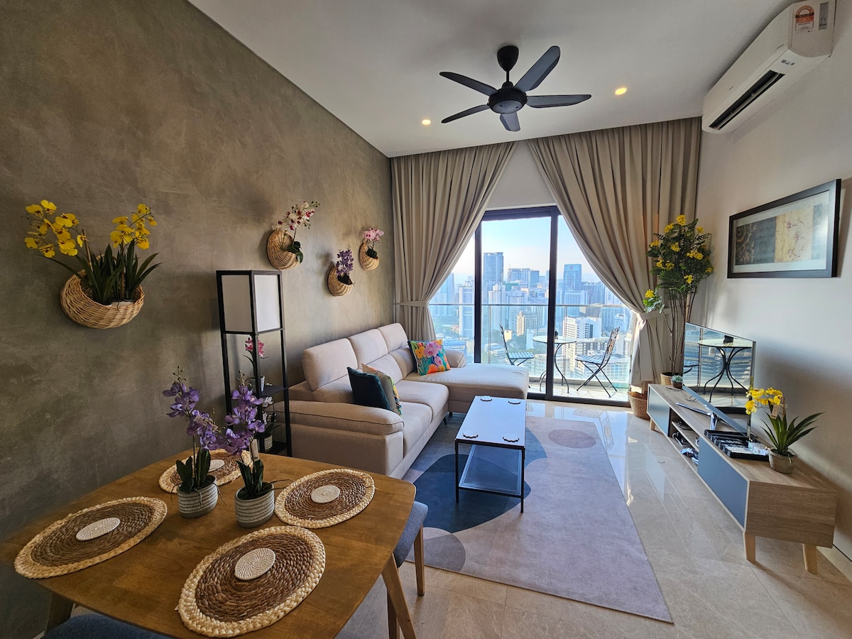 Sit back and relax in this calm, stylish space. Why Orchid 2BR suite at Lucentia Residence: - Best views of KL - Beautifully decorated with a fun spirit - Centrally located & attached to public transit hub - Fast wifi - 2 TVs with Netflix & others - 2 gorgeous pools - Family friendly with baby crib & highchair - Gym, pool table, BBQ pits, piano - Garage parking - Recommended to Sleeps 5, max 6 - LaLaPort Shopping Mall & the WOW entertainment street are attached - Grocery, drug store & Cinema etc