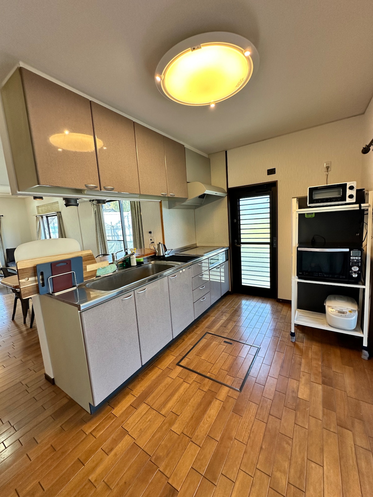 A large private hotel of 170 ㎡, about 500 m from the new downtown in the center, with many paid parking lots nearby. 1st floor ・ Living room / dining room / kitchen (30 ㎡) ・ Bedroom (30㎡) - Bath Toilet [2F] Bedroom (30㎡) Bedroom (13㎡) ・ Bedroom (13 ㎡) Toilet The kitchen is also equipped with a refrigerator, simple cookware, dishes, microwave, open toaster, electric kettle, etc. There is also a convenience store, a coin laundry, a supermarket, and Don Quixote nearby, and it is recommended for long-term stays. A place for families and group travelers to enjoy conversations while traveling! We have secured a large living space with this theme.