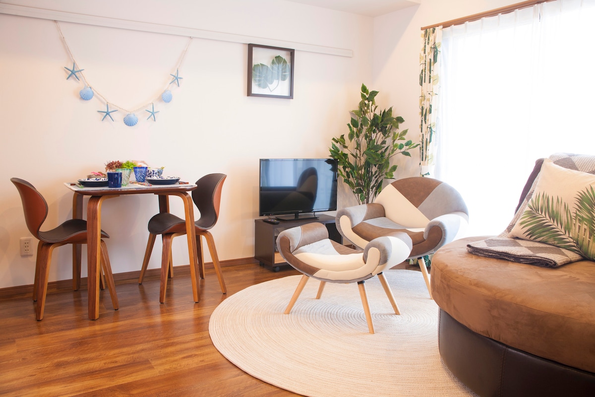 A 66 square meter condo with a panoramic ocean view. Can walk or take sightseeing cars to Aquarium and further to Emerald Beach through the park. 30-sec walk to a mall with Starbucks, etc., 3-min walk to the bus stop from Airport. 5-min walk to a Family Mart. Nearby hotel has a hot spring & a pool. If you bring pets, please contact us before booking. Only small dogs (2 dogs maximum) are allowed. Extra charge for pets 1 small dog 4400JPY 2 small dogs 5500 JPY We no longer provide seasonings.