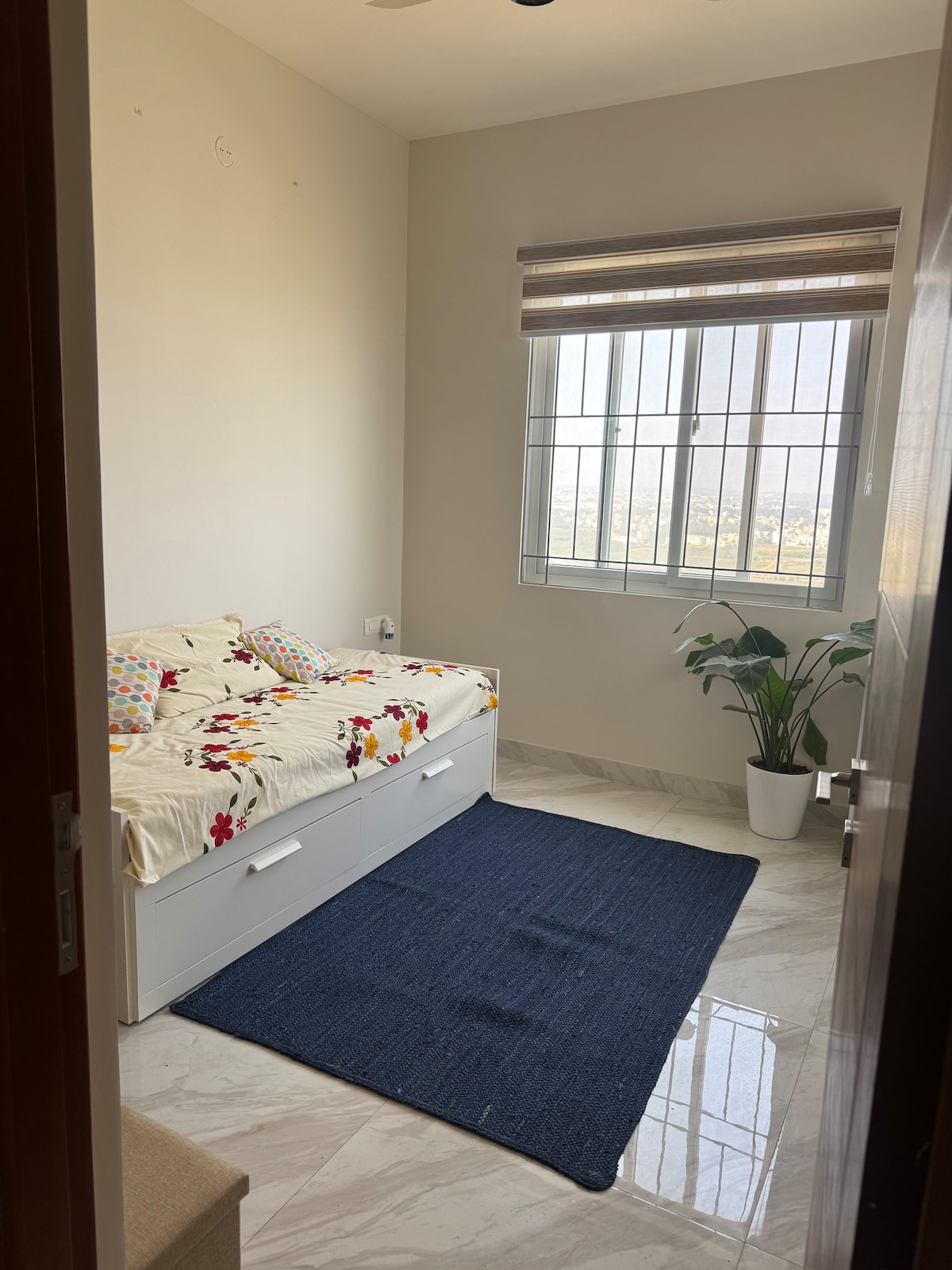 This is a private room inside a 4bhk Penthouse on the 38th floor with a separate entrance to the room, an attached bathroom, 55" TV, WiFi, AC and a dedicated workspace. The door leading to the rest of the penthouse can be locked, making it a super cozy private room for yourself. Suitable for couples, family, or individuals travelling for work. Basic crockery and cutlery available inside the room. Toiletries are provided. Free parking, walkways, children's playground and pool can be accessed.